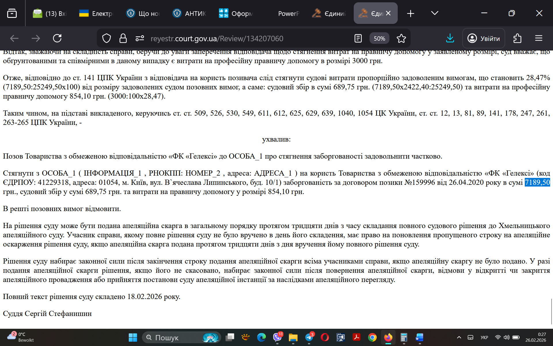 Взагалі по стягненню з цієї юр. особи маю понад двадцять справ, по всіх стягнуто і фактично отримано моїми клієнтами кошти.